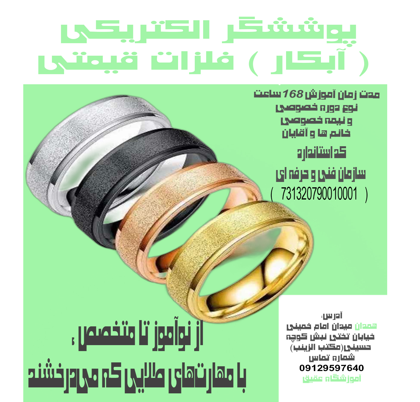آیا به دنبال یک حرفه پردرآمد و مورد تقاضا هستید؟ دوره آموزشی پوششگر الکتریکی (آبکار) فلزات قیمتی دقیقاً همان چیزی است که نیاز دارید. با یادگیری تکنیکهای نوین پوششدهی، در صنعت جواهرات و فلزات گرانبها متخصص شوید و فرصتهای شغلی بینظیری را از آن خود کنید. همین حالا ثبتنام کنید و مهارتهای طلایی کسب کنید!